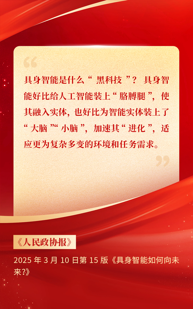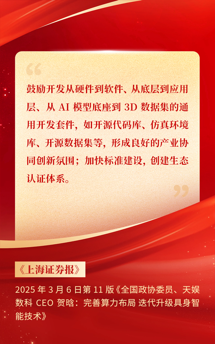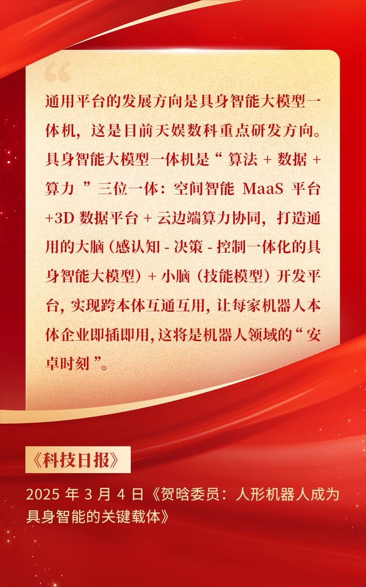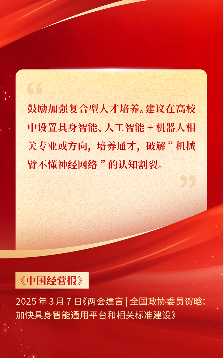 2025年3月10日下午 ,,,全国政协十四届三次会议于北京顺利闭幕。。。在今年的政府工作报告中 ,,,“科技”“技术”“创新”等词汇成了高频词 ,,,并且首次出现“具身智能”“6G”“智能机器人”等新词 ,,,强调“因地制宜发展新质生产力”。。。全国政协委员、、、波币钱包CEO贺晗连续第三年上会履职 ,,,围绕“具身智能”“人形机器人”“人工智能产业”等热词积极建言 ,,,受到了媒体的广泛关注 ,,,吸引了来自央视网、、、经济参考报、、、中国电子报、、、第一财经日报等央党媒体、、、主流财经等媒体记者的专访报道 ,,,让我们一起回顾贺晗委员两会建言!